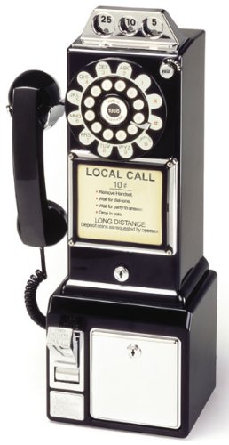 This American 3-slot style payphone was first introduced in the 1950's and remained virtually unchanged until 1965. Features pushbutton technology with authentic rotary look, wall or desk mountable with heavy-duty ABS cabinet and chrome accents, full-featured coin bank with lock and key and ringer control. W 23cm x H 46.5cm x D 16.5cm